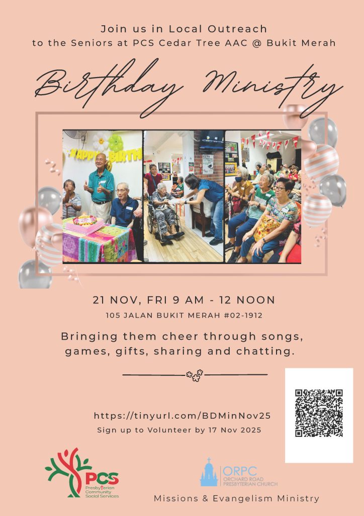 Calling all to minister God’s love and presence to residents at PCS Cedar Tree AAC@ Bukit Merah! Volunteer with us (both individuals and DGs are welcome) to spend a meaningful morning with the seniors through singing and music, games, facilitating activities, and conversations.