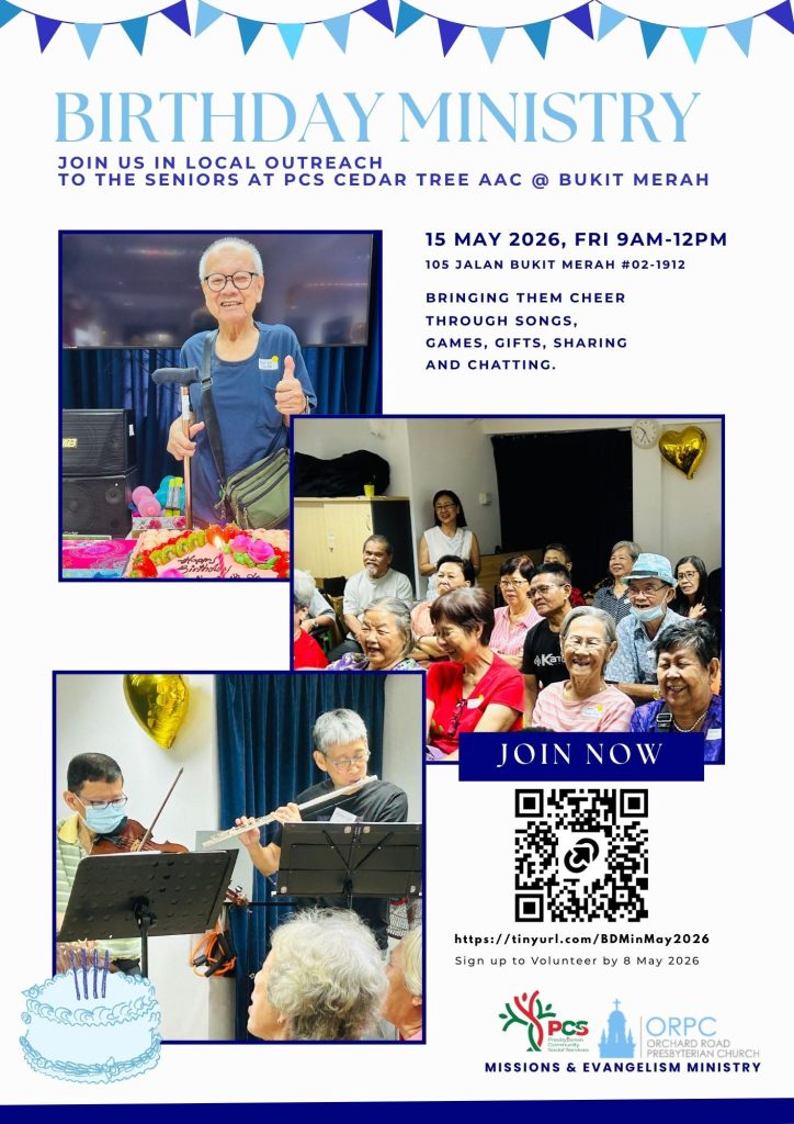 Block 105 Jalan Bukit Merah #02-1912, Singapore 160105 PCS Cedar Tree AAC @ Bukit Merah Directions Birthday Ministry at PCS Cedar Tree AAC @ Bukit Merah Date 15 May 2026 Time 9:00 AM – 12:00 PM Register Sharing God’s love with the seniors through singing, music, games, facilitating activities and conversations.