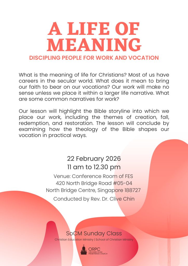 420 North Bridge Road #05-04 Singapore 188727 Conference Room of Fellowship of Evangelical Students (FES) Offices @ North Bridge Centre Directions Discipling People for Work and Vocation Date 22 Feb 2026 Time 11:00 AM – 12:30 PM After Sunday AM service Category Talks/Seminars/Workshops SoCM Sunday Class 11am – 12.30pm, Sunday, 22 February 2026 @ North Bridge Centre