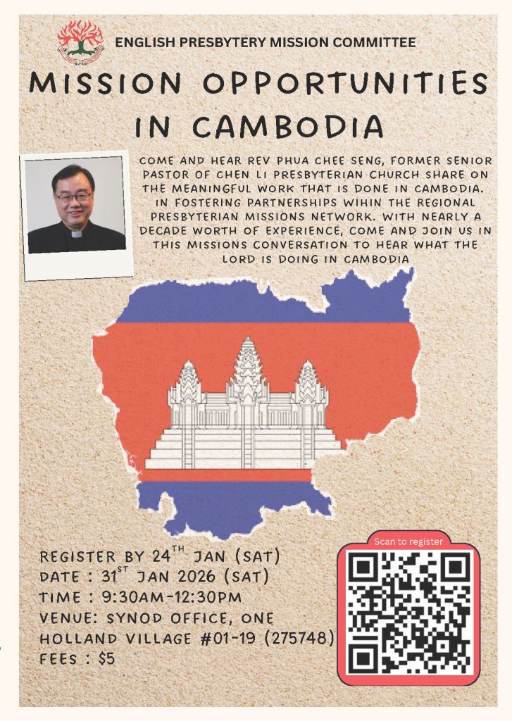 EPMC – Mission Opportunities In Cambodia Date 31 Jan 2026 Time 9:30 AM – 12:30 PM Address 7 Holland Village Way, One Holland Village #01-19, Singapore 275748 Directions Venue PCS Synod Office @ OHV Category Synod/EP Events Register