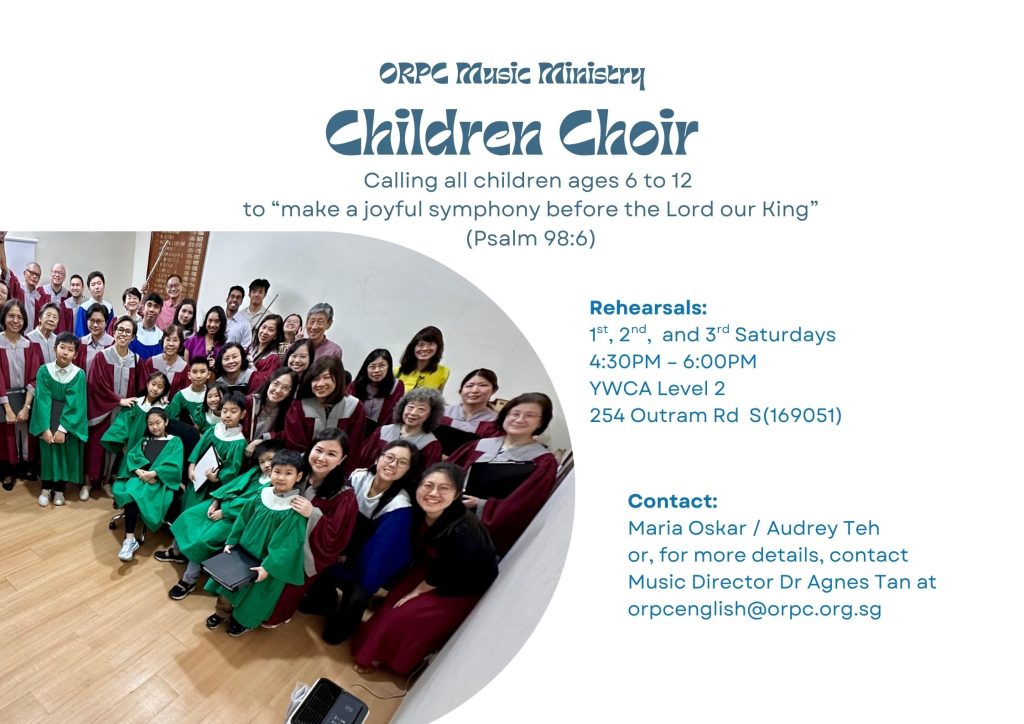 254 Outram Road Singapore 169051 YWCA Outram Level 2 Studio Directions ORPC Music Ministry Children Choir Date 18 Apr 2026 Time 4:30 PM – 6:00 PM Category Children Choir Recruitment Calling all children for ORPC Music Ministry